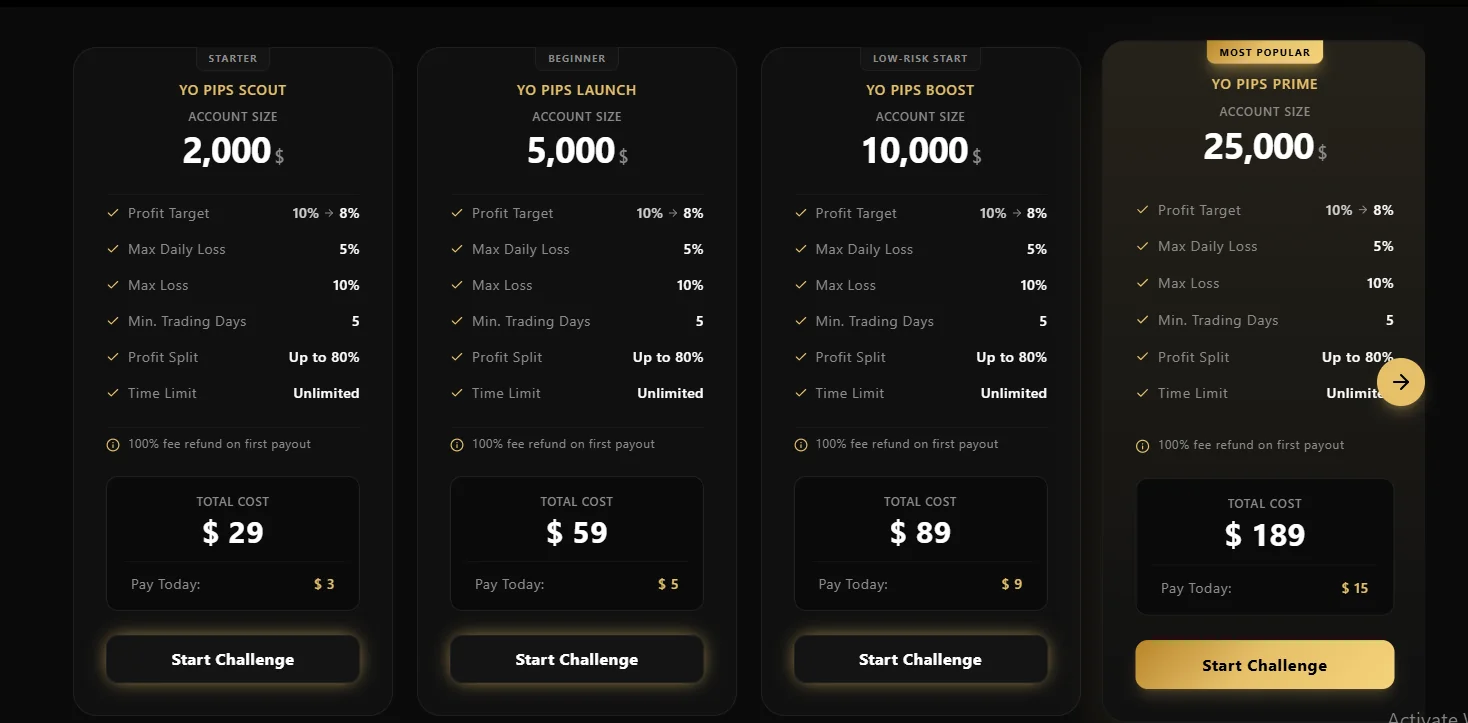 YoPips account size pricing, YoPips pricing plan, YoPips funded account cost
